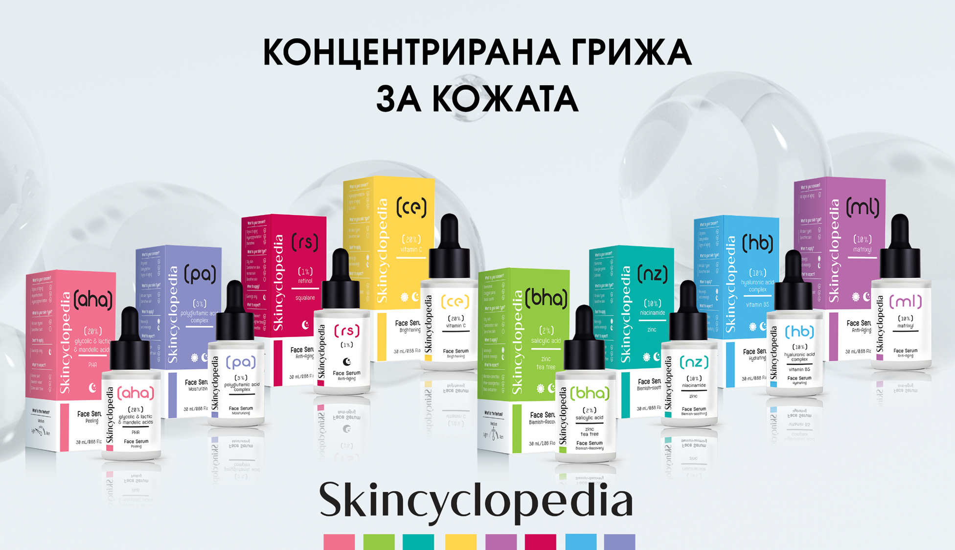 Skincyclopedia  е научнобазирана марка, която предлага концентрирани формули. Адаптирани, за да aдресират широк кръг от проблеми на различните типове кожа. Основана върху функционалност, минимализъм и експертиза в козметологичната наука. Първостепенната мисия на марката е да предостави ефективни решения в грижата за кожата на ентусиасти и на селективни ценители на козметиката. Нашият стремеж е да демистифицираме козметичните продукти чрез ясна и лесноразбираема марка-наръчник за здрава и естественокрасива кожа.